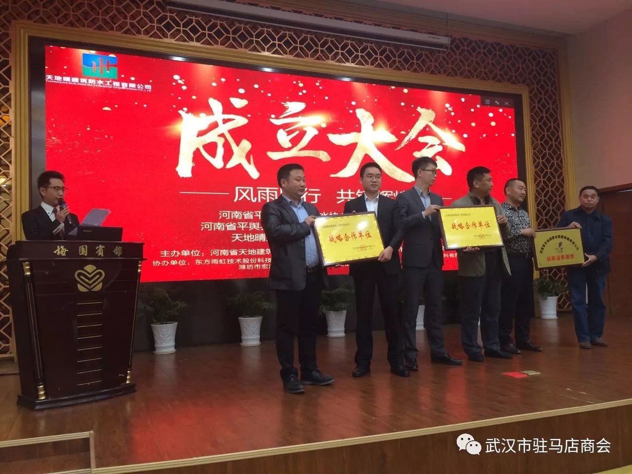 10月29日上午,河南省平舆县防水协会驻武汉办事处成立大会在武汉梅园酒店隆重召开,来自河南及湖北省防水行业相关代表150余人应邀出席活动。平舆县防水协会会长褚立国,党总支书记高伟为武汉办事处授牌。武汉驻马店商会副会长、河南天地建筑防水工程有限公司总经理李柏松被聘为武汉办事处主任。武汉驻马店商会受邀参会,会长孙前进致贺词,武汉驻马店商会常务副会长戴若玲、李留柱,副会长马玲参会。