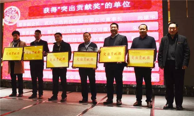(湖北省民政厅巡视员、武汉驻马店商会荣誉会长文增显为获得突出贡献奖的会长授牌)